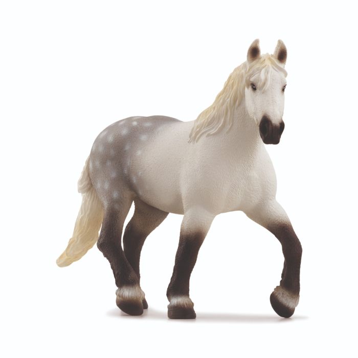 Il s'agit d'une figurine détaillée et peinte à la main d'un cheval Percheron, une race puissante et majestueuse connue pour sa carrure robuste et sa nature amicale. La figure montre la jument Percheron dans une pose réaliste et élégante, avec sa masse musculaire impressionnante et un beau pelage qui reflète les caractéristiques typiques de cette race, comme la couleur sombre des pattes et la finition fine de la crinière et de la queue.