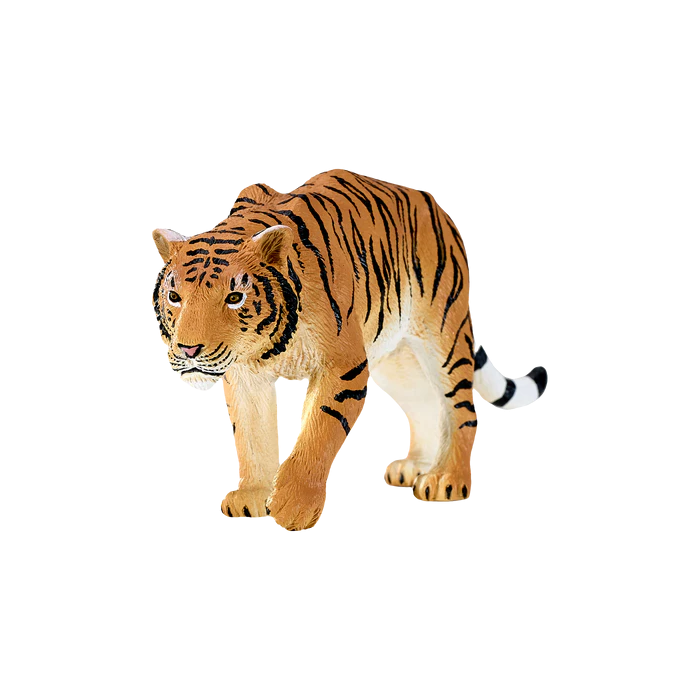 Il s'agit d'une figurine dynamique et détaillée qui capture magnifiquement la puissance et l'agilité de ce majestueux chat prédateur. Le tigre est représenté dans une pose de traque, de chasse, avec des muscles tendus et un regard perçant, prêt à traquer sa proie.