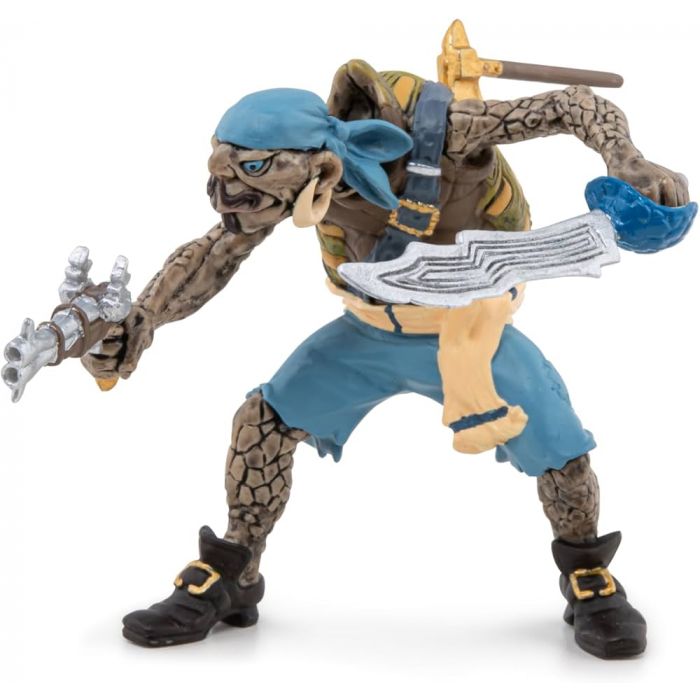 Il s'agit d'une figurine de la collection « Pirates et Corsaires » de Papo. Cette figurine représente une créature hybride, mi-humaine et mi-tortue, faisant de lui un pirate redoutable qui excelle aussi bien sur terre que dans l'eau.
