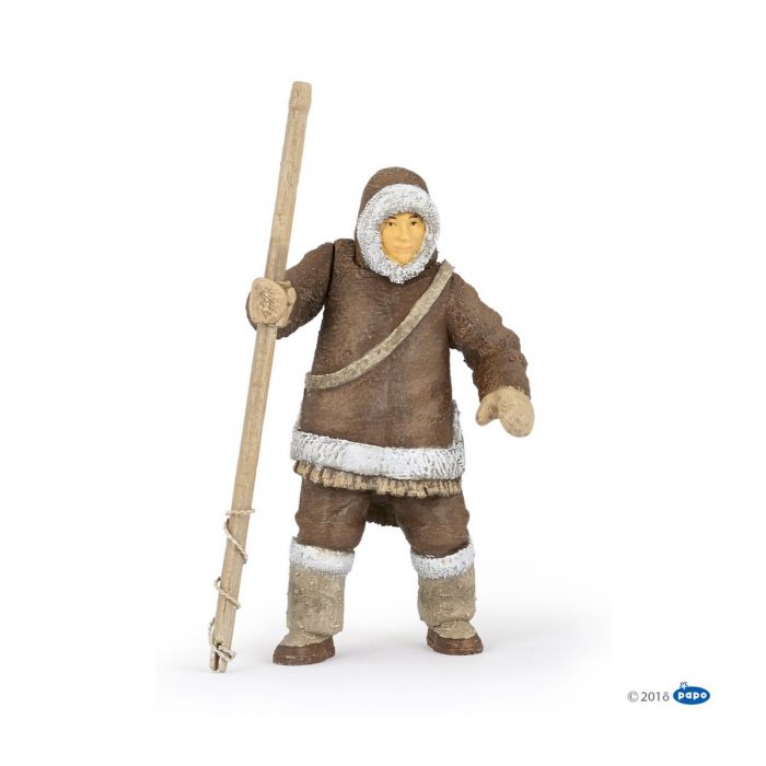 Il s'agit d'une figurine détaillée et peinte à la main d'un Esquimau inuit. Les vêtements sont soigneusement sculptés pour refléter la texture et la chaleur du matériau. La figure tient une lance, soulignant les pratiques de chasse traditionnelles des Inuits.