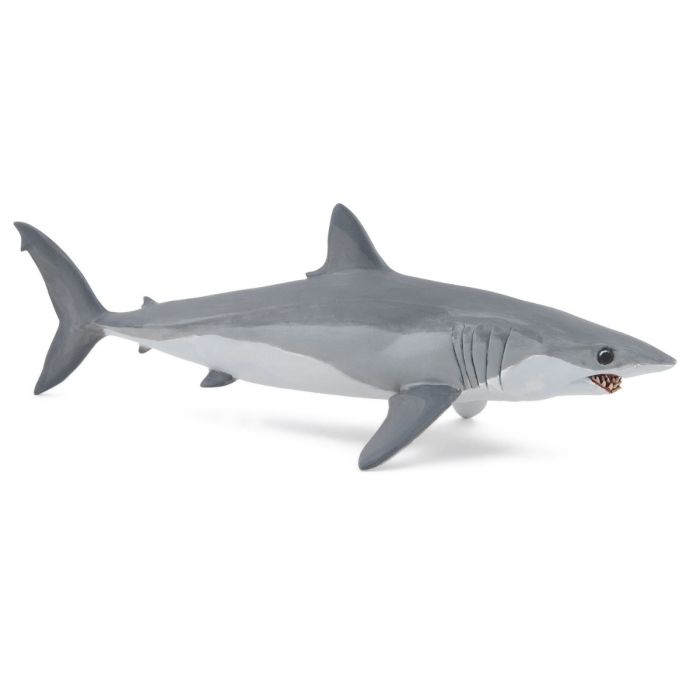 Il s'agit d'une figurine détaillée et peinte à la main d'un requin maoki. La figure montre un corps profilé avec un museau pointu, des dents acérées et une nageoire caudale puissante, typique du requin mako. Le dégradé de couleurs allant du gris foncé au dos vers un dessous plus clair souligne l'aspect réaliste.