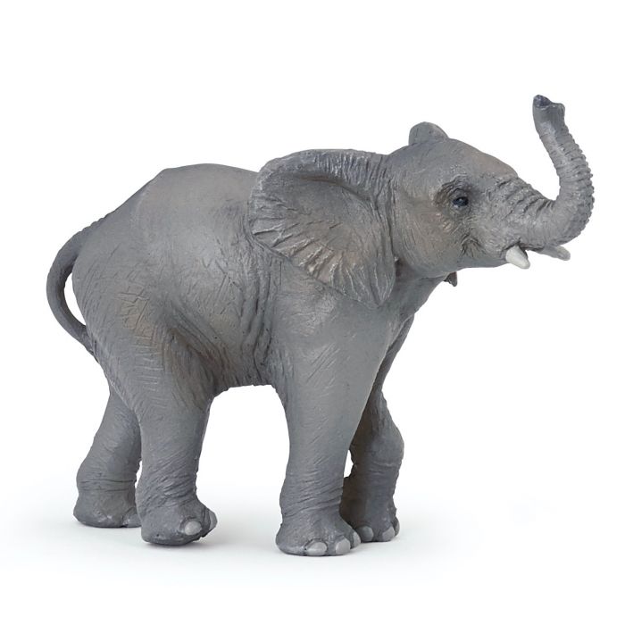 Il s'agit d'une figurine détaillée et réaliste représentant un jeune éléphant d'Afrique. La figurine représente un jeune éléphant avec une texture de peau détaillée, de grandes oreilles et une trompe courte, ce qui contribue à une apparence réaliste.