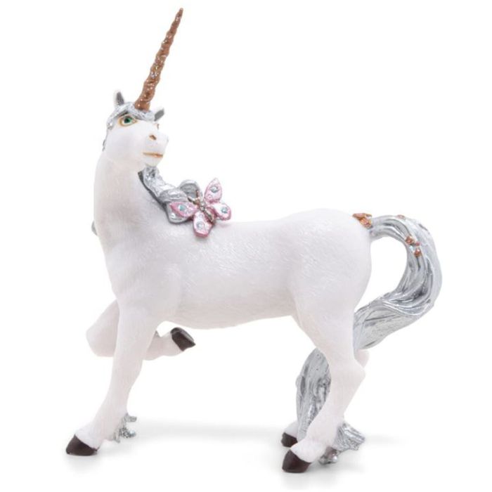 Il s'agit d'une figurine de jeu enchanteresse de la collection Fantasy World de Papo. Cette figurine représente une licorne élégante avec une crinière et une queue argentées, une corne dorée scintillante et un papillon rose posé sur son dos.
