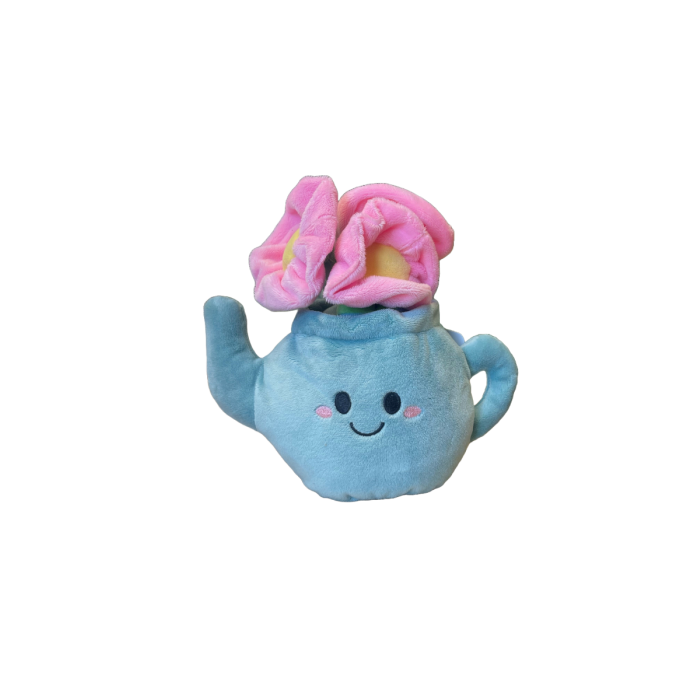 La théière en peluche Take Me Home Plant. Une adorable et douce théière en peluche bleue avec une fleur épanouie. Parfaite comme décoration, ami câlin ou cadeau unique!